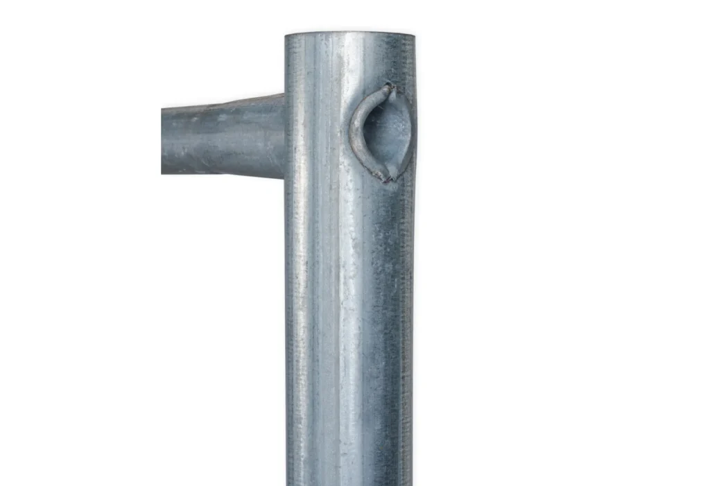 Unter den Paneelen in vorverzinkter Ausführung durfte natürlich auch ein Paneel mit konturiertem Design nicht fehlen. Dieses Modell ist Mobilzaun Round 10069.4, ein klassisches Round 3500×2000, Masche 100×300. Das Gewicht eines Feldes beträgt 14 kg.